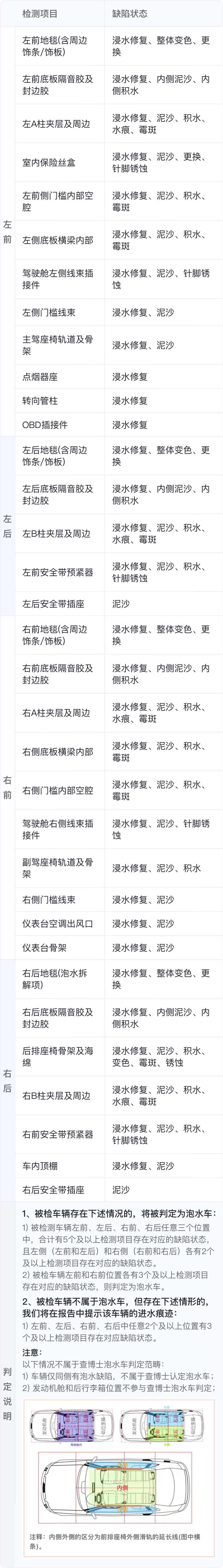 2、发动机舱和后行李箱位置出现泡水缺陷时,由于两处位置均不参与查博士泡水车判定,因此即使有进水痕迹也不会认定为泡水车